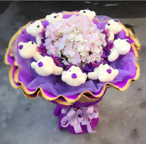 材质: 精选9只可爱小熊 中间一枝绣球花 紫纱围绕 精致包装