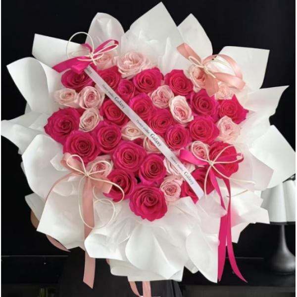 材质: 21枝佛洛依德玫瑰,16枝粉玫瑰,四个丝带如图制作