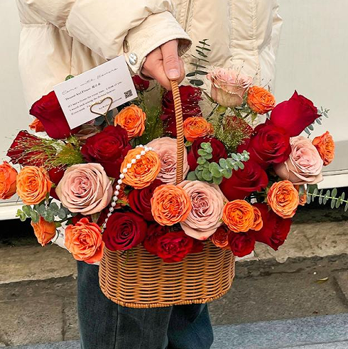 | 材质: | 33枝卡布奇诺加红玫瑰混搭,橙色泡泡丰满,尤加利叶,喷泉草搭配,手提花篮 | ||||