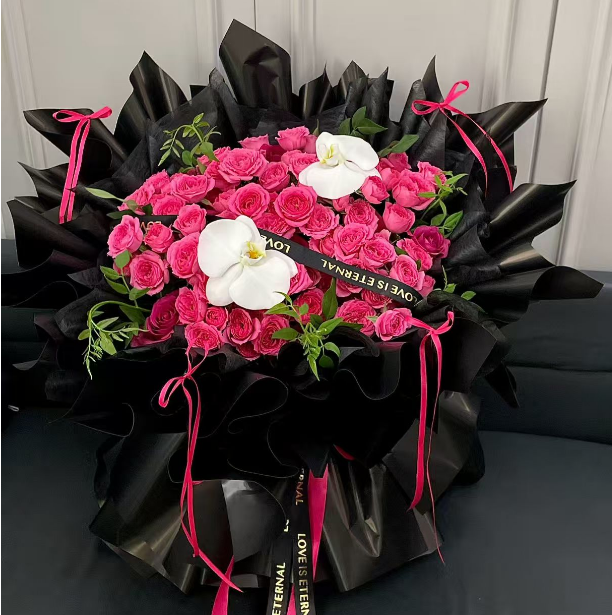 | 材质: | 66枝弗洛伊德玫瑰,2枝蝴蝶兰,紫色+黑色丝带 如图制作,七星叶搭配 |