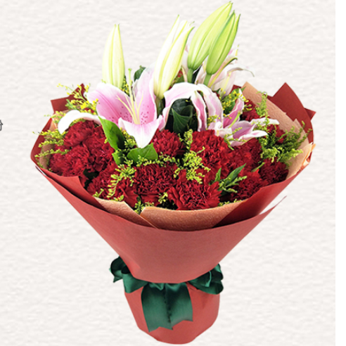 材质: 精选19朵红色康乃馨,7朵百合黄英搭配