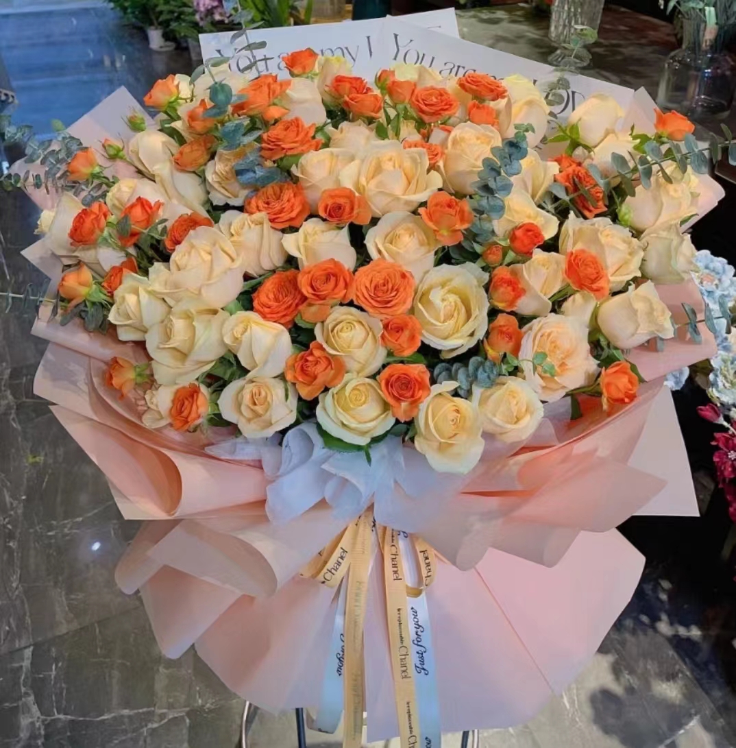 材质: 56枝香槟玫瑰,10枝多头狂欢泡泡,尤加利叶搭配