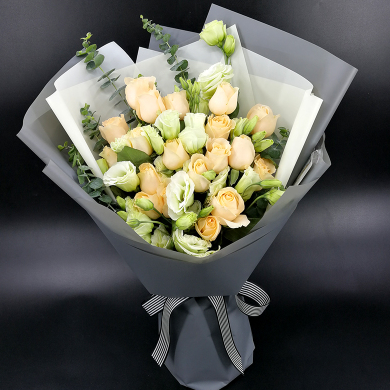 | 材质: | 19朵香槟玫瑰,洋桔梗、尤加利叶间插点缀搭配 | ||||