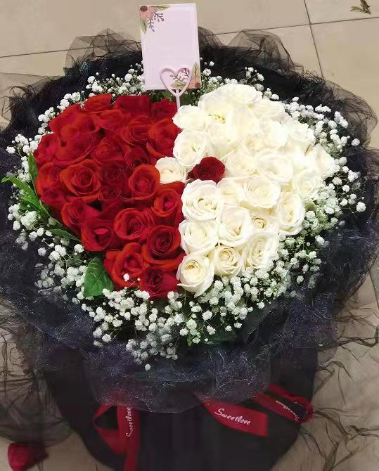 材质: 52支红 白玫瑰混搭做出心形,满天星,绿叶搭配