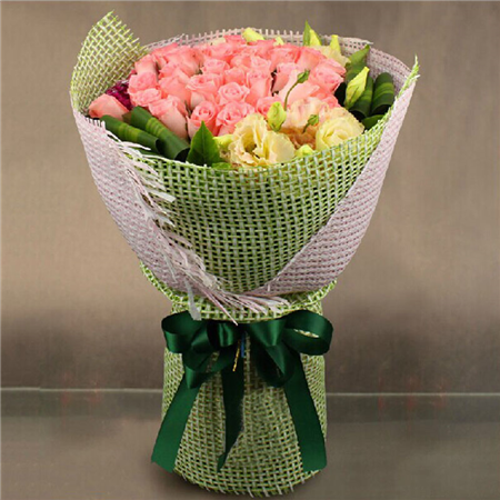材质: 33朵A级Diana粉玫瑰,点缀龙胆、石竹梅、巴西叶(因季节不同,辅材随机更改为黄莺,栀子叶或者满天星)