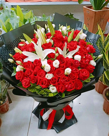 材质: 66枝红玫瑰,8朵白色百合,桔梗,绿叶插间