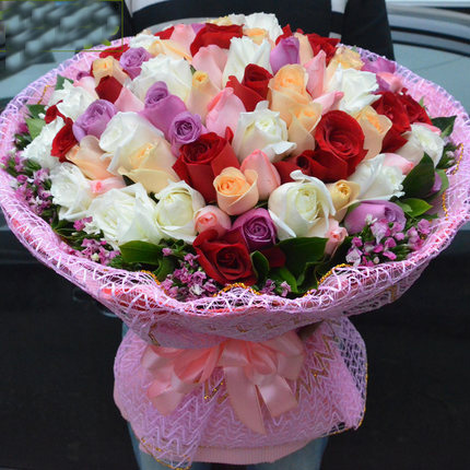 材质: 粉色 红色 白色 香槟色 紫色玫瑰合计66朵如图搭配 相思梅 绿叶搭配