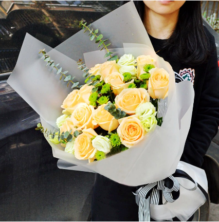 | 材质: | 精选15枝香槟玫瑰 小绿菊 桔梗 尤加利叶搭配 | ||||