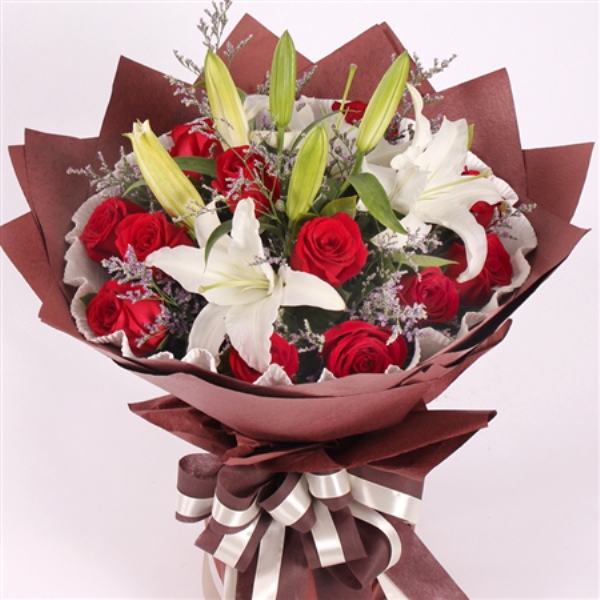 材质: 精心挑选11朵红玫瑰,2枝多头百合,情人草点缀,组成美丽花束