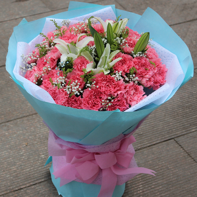 材质: 精选粉色康乃馨33朵 6朵百合 黄英 满天星搭配