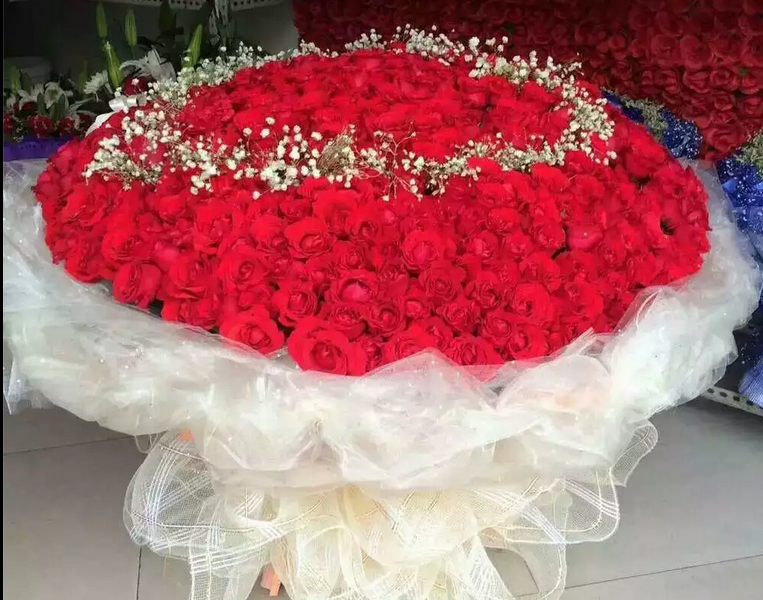 | 材质: | 精选999朵红玫瑰,满天星中间围城心形 | ||||