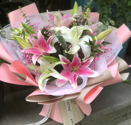 材质: 21朵粉色和白色百合混搭,满天星,尤加利叶搭配