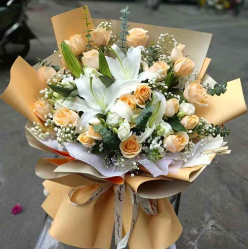 | 材质: | 21枝香槟玫瑰,5朵百合,白色洋桔梗,满天星,尤加利叶搭配 | ||||