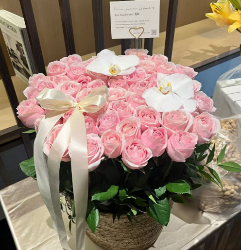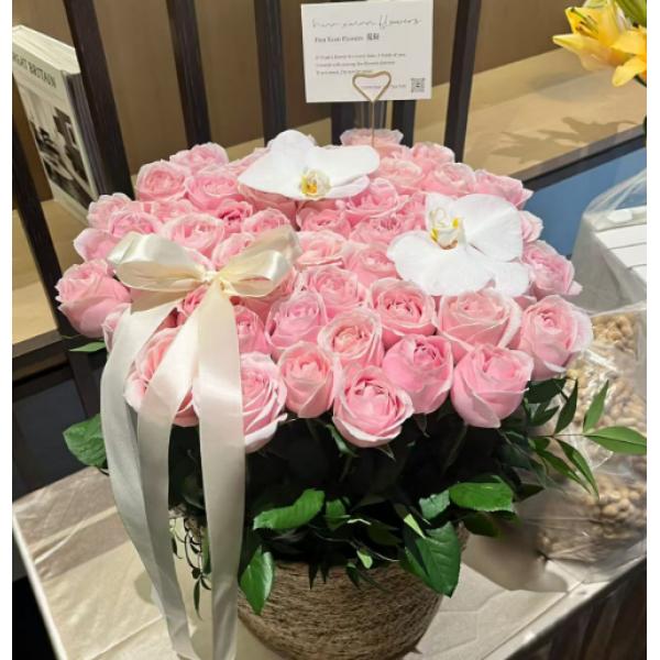 材质: 精选52枝粉玫瑰,2枝蝴蝶兰,七星叶搭配,