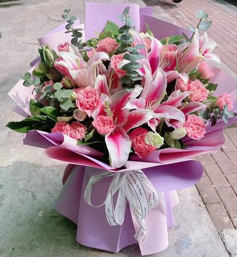 材质: 21枝粉色康乃馨,6朵百合,尤加利叶,洋桔梗,栀子叶丰满