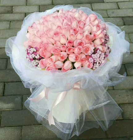 材质: 99朵粉玫瑰,相思梅点缀,白纱包装