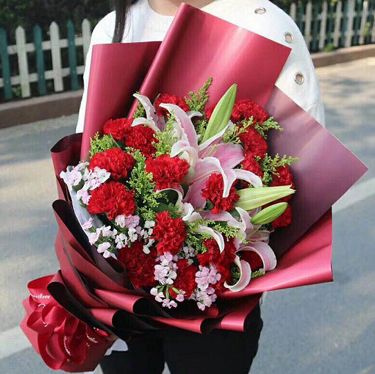 材质: 精选19枝红色康乃馨 8朵百合,黄英丰满,相思梅点缀