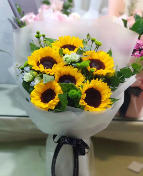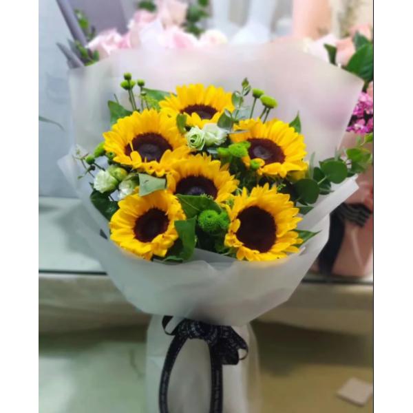 材质: 6枝向日葵,桔梗,小绿菊,绿叶搭配