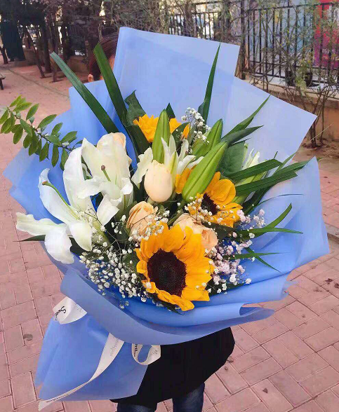 材质: 精选3朵向日葵 5朵香槟玫瑰 9朵百合 满天星 绿叶搭配