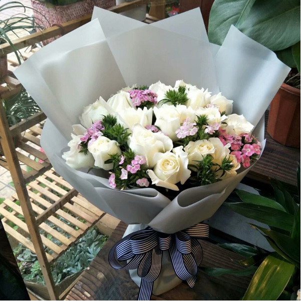 | 材质: | 19枝白玫瑰搭配相思梅 | ||||