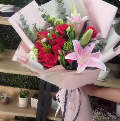 材质 11枝红玫瑰,4朵粉百合,若干桔梗,黄英,尤加利叶搭配