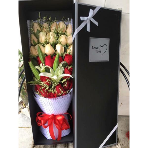 材质: 15枝香槟玫瑰,14枝红玫瑰,2枝多头白百合,水晶草搭配