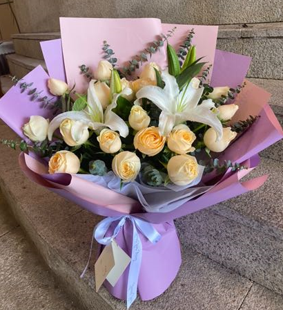 材质: 19枝香槟玫瑰,5朵百合 搭配尤加利叶