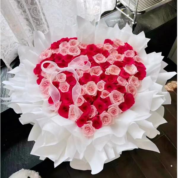 材质: 精选99枝精品红玫瑰+粉荔枝 丝带 如图制作心形