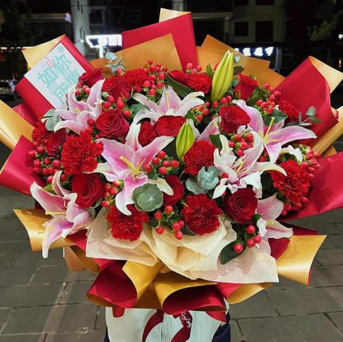 10朵红玫瑰,9朵红色康乃馨,10朵粉百合,红豆,尤加利叶搭配