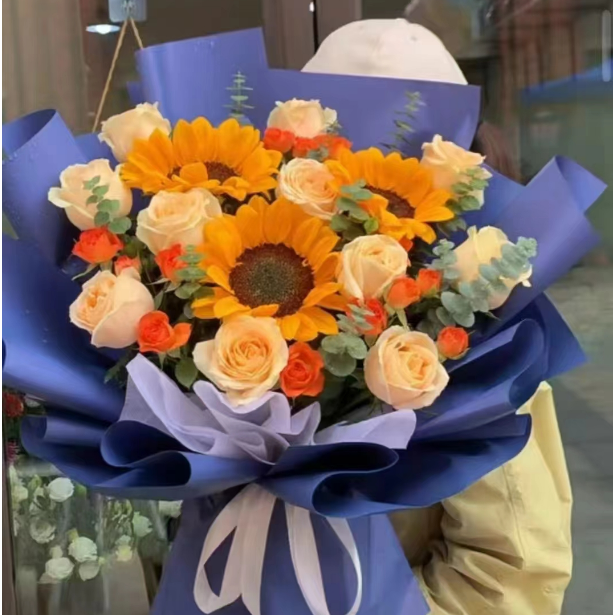 3枝向日葵,11枝香槟玫瑰,3枝橙色泡泡,尤加利叶搭配