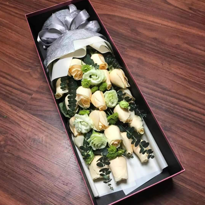 19枝香槟玫瑰,洋桔梗,尤加利叶,小雏菊搭配