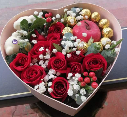 11枝红玫瑰,9颗巧克力,2只小熊,满天星,红豆,尤加利叶,栀子叶丰满