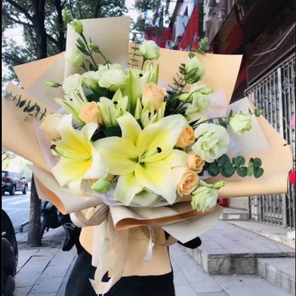 精选8朵黄百合,9朵香槟玫瑰,桔梗 尤加利叶搭配
