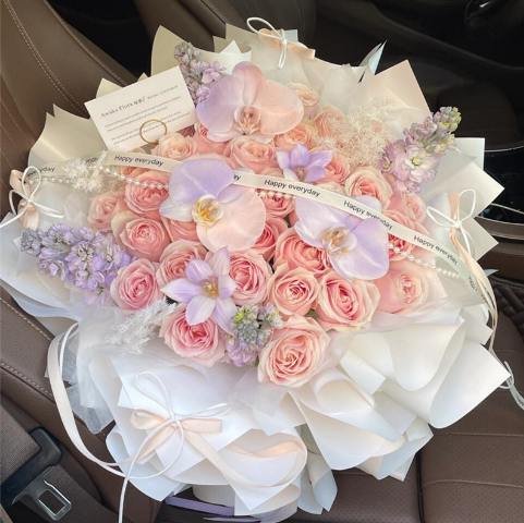 33枝粉玫瑰,3枝蝴蝶兰,2枝郁金香喷色,