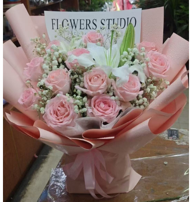 精选12枝戴安娜玫瑰,1枝多头百合,白色满天星搭配