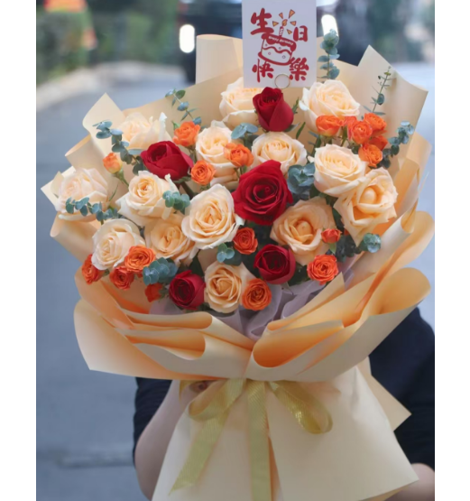 精选14枝香槟玫瑰,5枝红玫瑰,4枝多头橙色泡泡,尤加利叶搭配