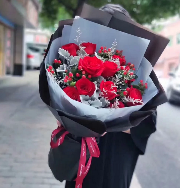 11朵红玫瑰,相思红豆,情人草,银叶菊搭配