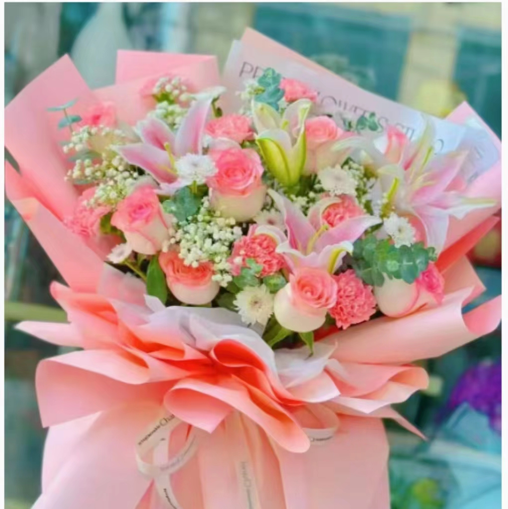 11枝爱莎玫瑰,8枝粉色康乃馨,2枝多头百合