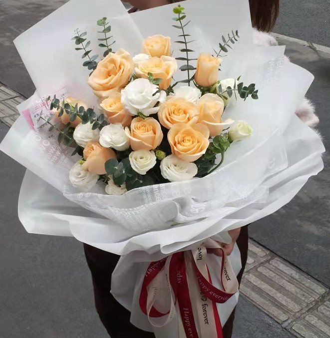 精选11枝香槟玫瑰,桔梗丰满,尤加利叶搭配