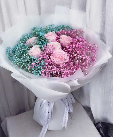 精选6枝戴安娜玫瑰,蓝色粉色各一半组成美丽的花束