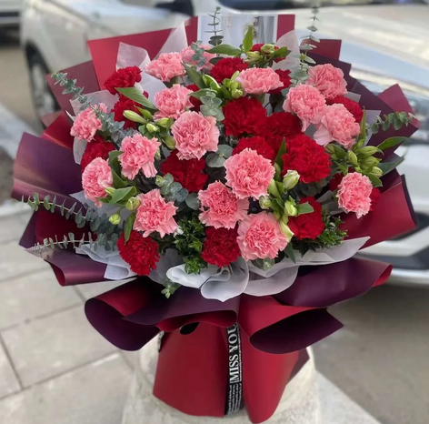 33枝红粉康乃馨混搭,洋桔梗,尤加利叶搭配