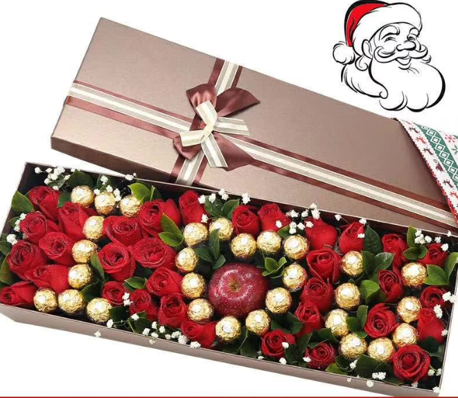精选33朵红玫瑰,28颗巧克力,拼出“”I O U"字样1个苹果,栀子叶 满天星搭配