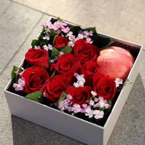 精选9朵红玫瑰,一颗苹果。相思梅 绿叶搭配