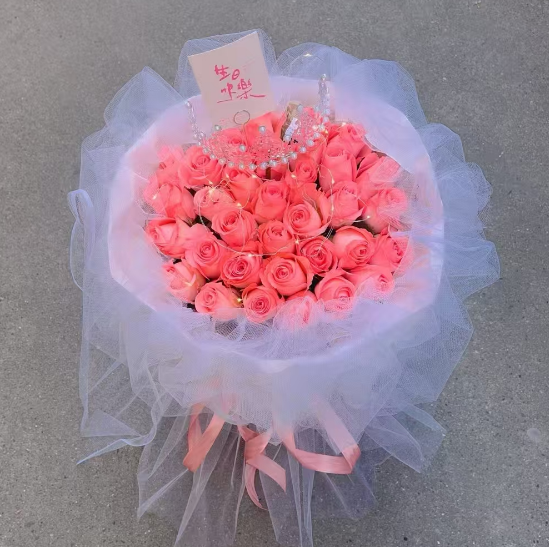 精选33枝戴安娜粉玫瑰,满天星 相思梅搭配