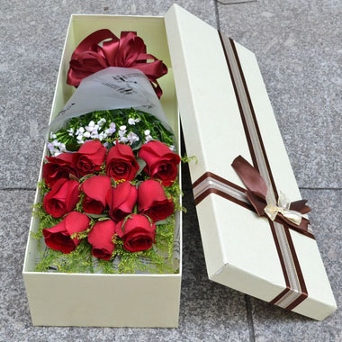 11枝红玫瑰,黄英 相思梅或者满天星搭配 精致礼盒装