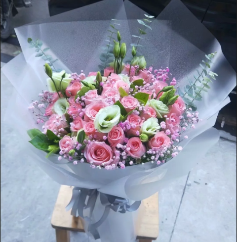 精选33朵粉玫瑰,桔梗 满天星 尤加利叶搭配