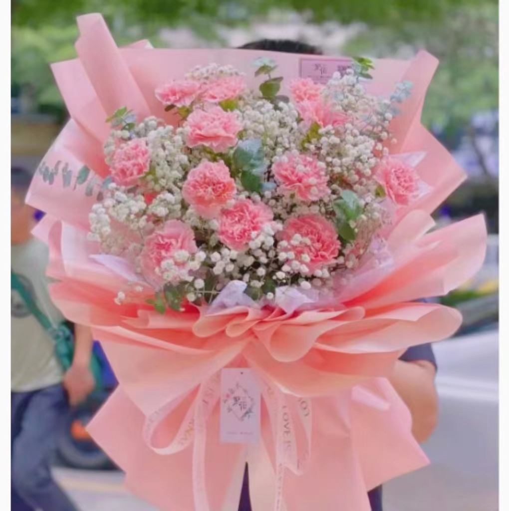 15枝粉色康乃馨,满天星丰满,尤加利叶搭配