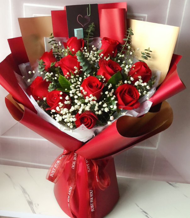 11枝红玫瑰,满天星、尤加利叶丰满
