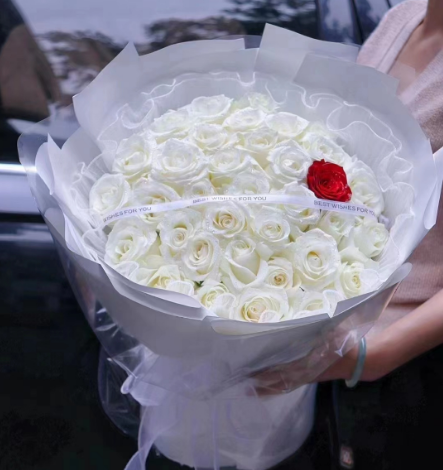 51枝白玫瑰,1枝红玫瑰,字母丝带
