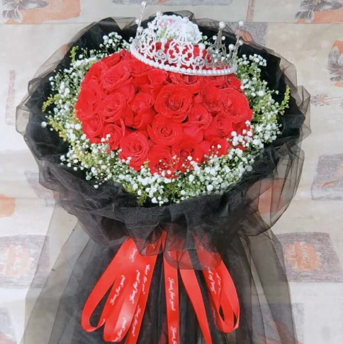 33枝玫瑰,一个皇冠,黄莺,满天星搭配